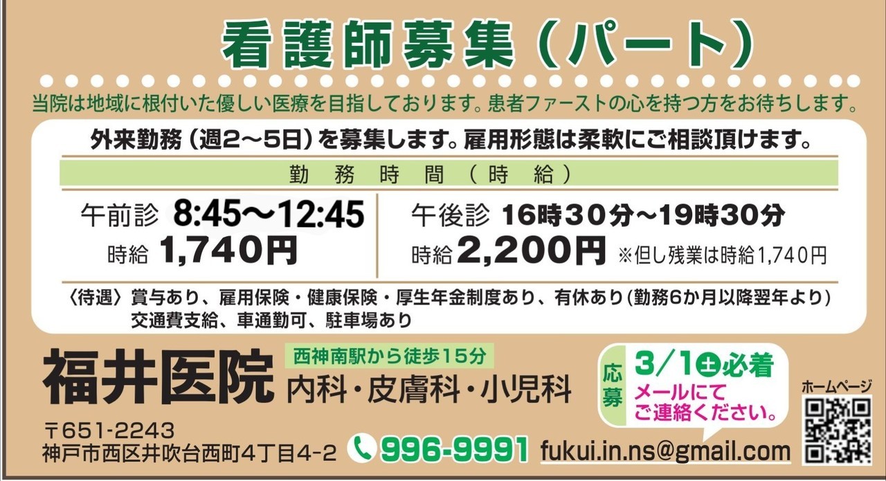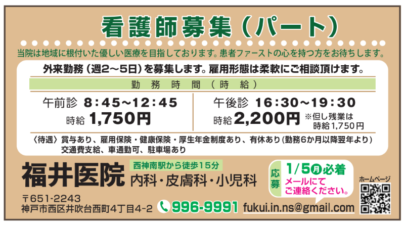 働きやすい環境と時間帯での勤務で、子育て中の方やブランクのある方も迎します。週2~5コマ程度(午前診1コマ4時間程度、夜間診1コマ3時間程度)私たちと一緒に働きませんか。優しくてフレンドリーな院長とスタッフなので心配無用です。一人勤務はないので、分からない事やできない事があっても、必ずフォローしますので安心してください。有給休暇も取りやすく、急用の際も勤務交代カバー率100%で安心です。長く働いていただける方を是非お待ちしております!ご興味のある方はfukui.in.ns@gmail.comへお名前・ご連絡先・勤務希望内容をご記入の上お申し込み下さい。